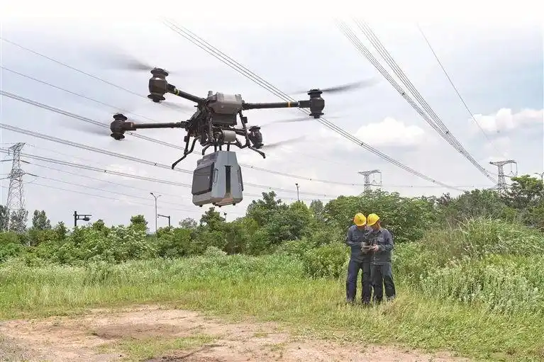 近年来,巡检机器人、修补机器人、水下机器人在电网运维中得到应用。图为国网绍兴供电公司工作人员操作搭载了地线断股带电修补机器人的无人机,对线路进行修复。新华社发