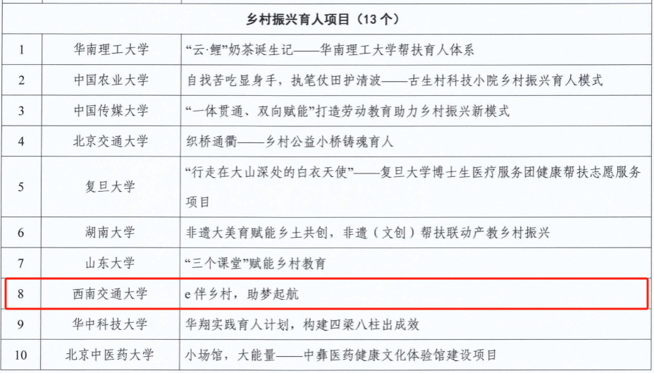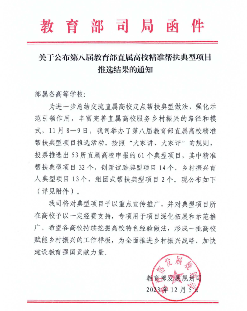 申报的《e伴乡村·助梦启航》和联合申报的《探索区域组团帮扶新模式,助推消费帮扶再上新台阶》两个案例从众多项目中脱颖而出,获评教育部直属高校精准帮扶典型项目。