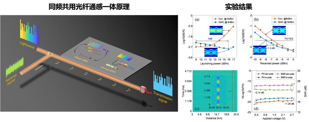据悉,“同频共用光纤通信传感一体系统”原创性提出同频共用(同一根光纤中的相同波长)一体化新范式:基于感-传信号同频融合思路,采用相同频谱资源和光纤信道,建立了通感一体系统架构。该成果既提高了通信感知融合效率(频谱效率提高),增加了光通信系统的分布式传感功能,同时利用光纤线性和非线性效应相互作用提升了传输性能,以更高的集成度和频谱效率开发光纤网络的传感功能。该成果以“Integrated sensing and communication in an optical fibre”为题,于2023年1月17日作为封面论文发表于《Light: Science & Applications》。