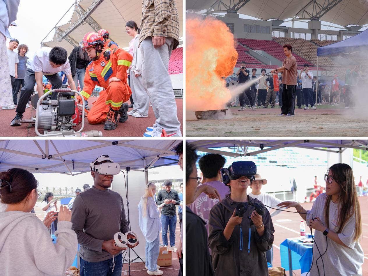 演练第二阶段为防灾减灾知识学习和应急技能体验活动。郫都区消防救援大队开放体验、手持灭火器体验、心肺复苏急救体验、3D仿真模拟灭火、模拟烟雾逃生帐篷、模拟灭火体验馆、防灾避险智多星知识竞赛、应急先锋VR疏散体验、安全知识长廊等项目吸引了众多师生。