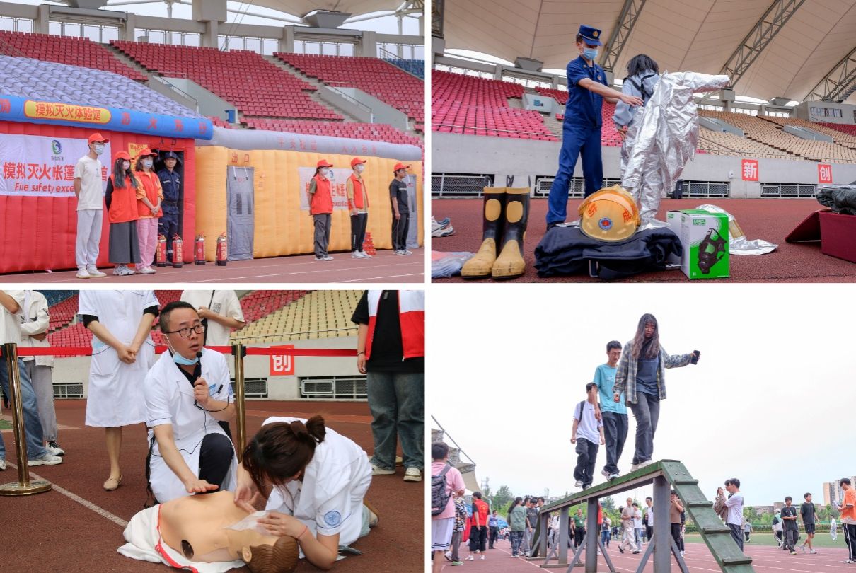 保卫处设置了灭火体验区,在现场点燃数个火盆模拟火灾现场,同学们在工作人员的指引下,成功使用干粉灭火器将火扑灭;校医院的医生们详细讲解了心肺复苏、AED(自动体外除颤器)的操作流程,并使用人体模型进行示范演示。在医生的指导下,同学们在现场进行了实践操作,亲身体验急救过程,将理论付诸实践,力求让每个动作做到准确、规范、到位。